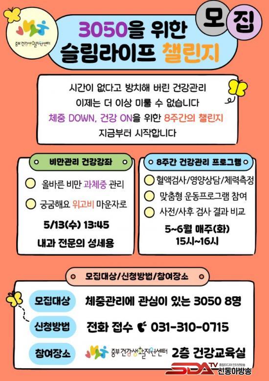 ¸ðÁý ´ë»óÀº üÁß °ü¸®¿¡ °ü½ÉÀÌ ÀÖ´Â 30~50´ë ¼ºÀÎ 8¸íÀ¸·Î, ÀüÈ(031-310-0715)¸¦ ÅëÇØ ½ÅûÇÒ ¼ö ÀÖÀ¸¸ç, ¼±Âø¼øÀ¸·Î ¸¶°¨µÈ´Ù.