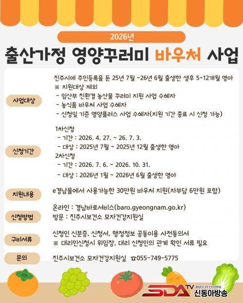 [½Åµ¿¾Æ¹æ¼Û °æ³²ÁøÁÖ=³²±Ã¿µ±â±âÀÚ] ÁøÁֽú¸°Ç¼Ò´Â Ãâ»ê °¡Á¤ÀÇ °æÁ¦Àû ºÎ´ãÀ» ´ú°í ¿µ¾ÆÀÇ °Ç°­ÇÑ ¼ºÀå°ú ¹ß´ÞÀ» Áö¿øÇϱâ À§ÇØ 2026³â ½Å±Ô»ç¾÷ÀÎ ¡®Ãâ»ê°¡Á¤ ¿µ¾ç²Ù·¯¹Ì ¹Ù¿ìó(Voucher) Áö¿ø»ç¾÷¡¯À» ¿À´Â 27ÀϺÎÅÍ ½ÃÇàÇÑ´Ù°í ¹àÇû´Ù.