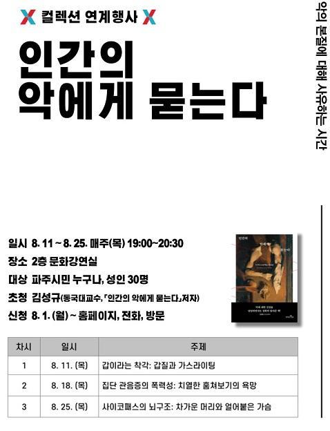 À̹ø °¿¬Àº ¼ºÀÎÀ» ´ë»óÀ¸·Î ÃÑ 3ȸ¿¡ °ÉÃÄ ÁøÇàµÇ¸ç, ¡ã°©À̶ó´Â Âø°¢: °©Áú°ú °¡½º¶óÀÌÆÃ ¡ãÁý´Ü °üÀ½ÁõÀÇ Æø·Â¼º: Àú¿ÇÑ ÈÉÃ帱âÀÇ ¿å¸Á ¡ã»çÀÌÄÚÆÐ½ºÀÇ ³ú±¸Á¶: Â÷°¡¿î ¸Ó¸®¿Í ¾ó¾îºÙÀº °¡½¿ ÃÑ ¼¼ °¡Áö ÁÖÁ¦·Î Á¤½ÅÀû º´ÁõÀ» ºñ·ÔÇØ ¡®¾Ç¡¯ÀÌ ³ªÅ¸³ª´Â ¿øÀÎÀ» ½É¸®ÇÐÀû °üÁ¡À¸·Î Ç®¾îº»´Ù.