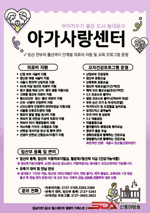 ÇÁ·Î±×·¥ ½Åû¡¤¹®ÀÇ´Â µ¿´ë¹®±¸ ¾Æ°¡»ç¶û¼¾ÅÍ(¢Ï02-2127-5603)¸¦ ÅëÇØ ¾È³»¹ÞÀ» ¼ö ÀÖ´Ù. ¾Æ°¡»ç¶û¼¾Åʹ û·®¸®¿ª 6¹ø Ãⱸ ÀαÙ(¼¿ï µ¿´ë¹®±¸ ´ä½Ê¸®·Î1±æ 10, 2Ãþ)¿¡ À§Ä¡ÇÑ ¸ðÀÚº¸°Ç¼¾ÅÍ·Î, Àӽš¤Ãâ»ê¡¤À°¾Æ ´Ü°èº° ÇÁ·Î±×·¥°ú »ó´ãµµ ¿î¿µÇÑ´Ù.