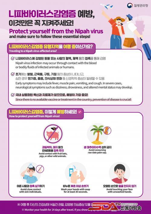 ´ÏÆÄ¹ÙÀÌ·¯½º °¨¿°ÁõÀº Ä¡¸í·üÀÌ 40~75%·Î ³ô°í ¹é½Å¤ýÄ¡·áÁ¦°¡ ¾ø´Â À§ÇèÇÑ Áúº´À¸·Î ¿¹¹æÀÌ ¹«¾ùº¸´Ù Áß¿äÇÏ´Ù. Àεµ¿Í ¹æ±Û¶óµ¥½Ã µî ´ÏÆÄ¹ÙÀÌ·¯½º °Ë¿ª°ü¸®Áö¿ªÀ» ¹æ¹®ÇÒ °æ¿ì °úÀϹÚÁ㳪 ¾ÆÇ µÅÁö µî ¾ß»ýµ¿¹°°úÀÇ Á¢ÃËÀ» ÇÇÇϰí, »ý ´ëÃß¾ßÀÚ ¼ö¾×À̳ª ¹Ù´Ú¿¡ ¶³¾îÁø °úÀÏ µî ¿À¿° °¡´É¼ºÀÌ ÀÖ´Â À½½Ä ¼·Ã븦 »ï°¡¾ß ÇÑ´Ù. ¶ÇÇÑ, ¾ÆÇ ȯÀÚÀÇ Ç÷¾×À̳ª ü¾×°úÀÇ Á÷Á¢ Á¢ÃËÀ» ÇÇÇϰí, ºñ´©¿Í ¹°·Î 30ÃÊ ÀÌ»ó ¼Õ ¾Ä±â¸¦ »ýȰÈÇÏ´Â °ÍÀÌ ±ÇÀåµÈ´Ù.