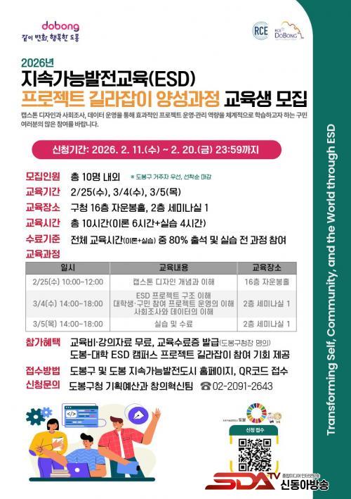 ±³À°Àº 2¿ù 25Àϰú 3¿ù 4ÀÏ, 3¿ù 5ÀÏ¿¡ °ÉÃÄ ÃÑ 10½Ã°£(ÀÌ·Ð 6½Ã°£, ½Ç½À 4½Ã°£) °úÁ¤À¸·Î, µµºÀ±¸Ã»¿¡¼ ÁøÇàµÈ´Ù. Ãâ¼®·ü 80% ÀÌ»ó ¹× ½Ç½À Àü °úÁ¤ Âü¿© ½Ã ±³À°¼ö·áÁõÀÌ ¹ß±ÞµÇ¸ç, ¡®µµºÀ-´ëÇÐ ESD Ä·ÆÛ½º ÇÁ·ÎÁ§Æ® ±æ¶óÀâÀÌ¡¯ Âü¿© ±âȸµµ Á¦°øµÈ´Ù.
