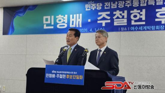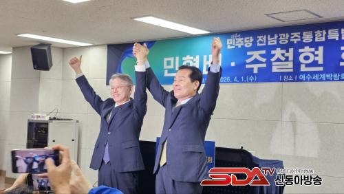 [½Åµ¿¾Æ¹æ¼Û ¿©¼ö=±è±â³² ±âÀÚ] ´õºÒ¾î¹ÎÁÖ´ç Àü³²±¤ÁÖÅëÇÕÆ¯º°½ÃÀå Èĺ¸ °æ¼±¿¡ ³ª¼± ÁÖöÇö Èĺ¸¿Í ¹ÎÇü¹è È帰¡ 1ÀÏ °øÅëÀÇ °¡Ä¡¡¤Á¤Ã¥¿¬´ë¸¦ ¹ÙÅÁÀ¸·Î Àü°ÝÀûÀÎ Èĺ¸ ´ÜÀÏÈ­¸¦ ¼±¾ðÇß´Ù.