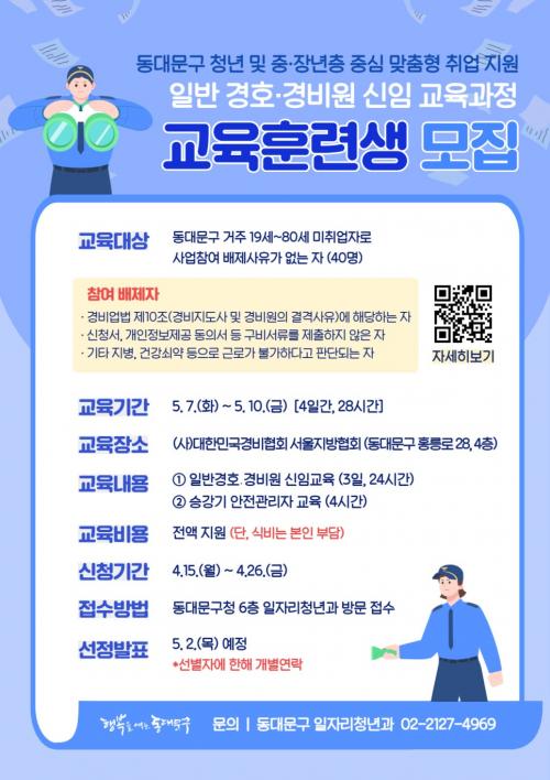 [½Åµ¿¾Æ¹æ¼Û µ¿´ë¹®=À̽ŵ¿±âÀÚ]¼­¿ï µ¿´ë¹®±¸´Â °æÈ£¡¤°æºñ¿øÀ¸·Î Ãë¾÷À» Èñ¸ÁÇϴ û³â~ÁßÀå³âÃþ ±¸Á÷ÀÚ¸¦ À§ÇØ ¡®ÀÏ¹Ý °æÈ£¡¤°æºñ¿ø ½ÅÀÓ±³À°¡¯ 1Â÷ Âü¿©ÀÚ¸¦ ¿À´Â 26ÀÏ(±Ý)±îÁö ¸ðÁýÇÑ´Ù. ÇØ´ç »ç¾÷Àº °æÈ£¡¤°æºñ¿øÀ¸·Î Ãë¾÷À» Èñ¸ÁÇÏ´Â ±¸¹Îµé¿¡°Ô ½ÇÁúÀûÀÎ Ãë¾÷¡¦