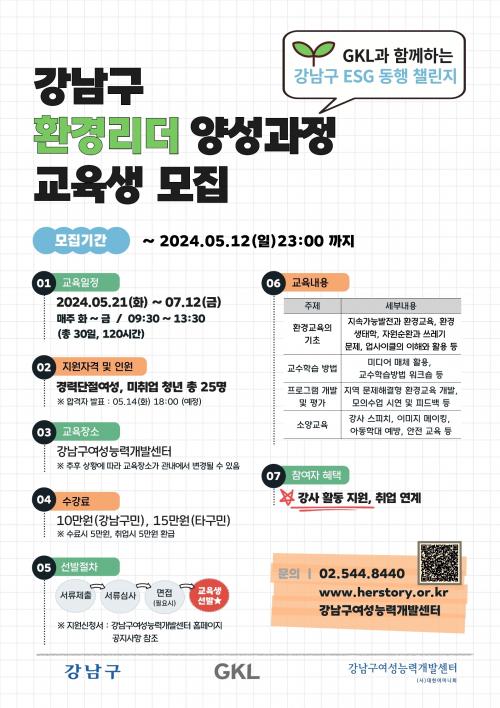 [½Åµ¿¾Æ¹æ¼Û °­³²±¸=À̽ŵ¿±âÀÚ]°­³²±¸°¡ ±×·£µåÄÚ¸®¾Æ·¹Àú(GKL)¿¡¼­ ÁÖ°üÇÏ´Â ¡®2024³â »çȸÀû °¡Ä¡ ½ÇÇöÀ» À§ÇÑ °ø¸ð»ç¾÷¡¯¿¡ ¼±Á¤µÅ ESG µ¿Çà 縰Áö »ç¾÷À» À§ÇÑ »ç¾÷ºñ 5500¸¸¿øÀ» È®º¸Çß´Ù. À̸¦ ¹ÙÅÁÀ¸·Î ±¸´Â °æ·Â´ÜÀý ¿©¼ºÀ» ȯ°æ ¸®´õ·Î ¾ç¼ºÇϰí Ȱµ¿À» Áö¿ø¡¦