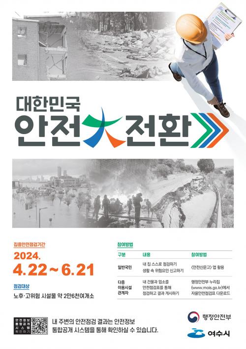 [½Åµ¿¾Æ¹æ¼Û ¿©¼ö=±è±â³² ±âÀÚ] ¿©¼ö½Ã(½ÃÀå Á¤±â¸í)°¡ ¿À´Â 6¿ù 21ÀϱîÁö Àç³­À̳ª »ç°í ¹ß»ýÀÌ ¿ì·ÁµÇ´Â ½Ã¼³ µî 156°÷À» ´ë»óÀ¸·Î ¡®ÁýÁß¾ÈÀüÁ¡°Ë¡¯À» ½Ç½ÃÇÑ´Ù. À̹ø Á¡°ËÀº Áö³­ 2015³âºÎÅÍ ½ÃÀÛµÈ ´ëÇѹα¹ ¾ÈÀü´ëÀüȯ ±â°£À» ¸Â¾Æ ¾ÈÀü°ü¸® ½ÇŸ¦ Á¡°ËÇÏ¡¦