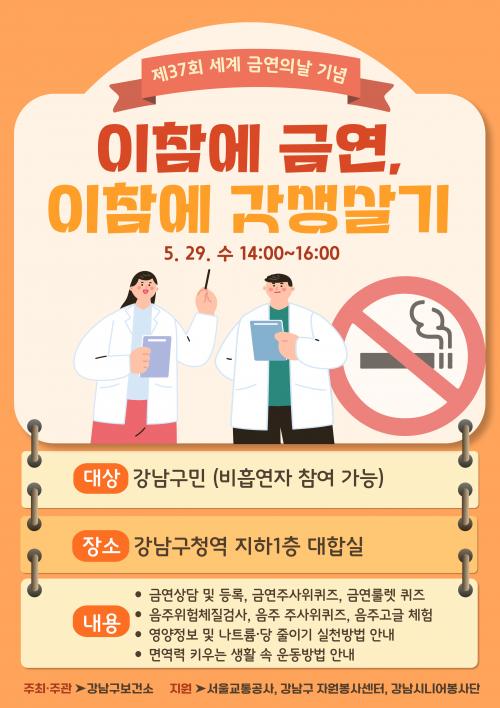 [½Åµ¿¾Æ¹æ¼Û °­³²±¸=À̽ŵ¿±âÀÚ]°­³²±¸°¡ Á¦37ȸ ¼¼°è ±Ý¿¬ÀÇ ³¯À» ¸ÂÀÌÇÏ¿© 5¿ù 28ÀÏ~29ÀÏ¿¡ °Å¸® Ä·ÆäÀÎÀ» ÆîÄ£´Ù. ¼¼°èº¸°Ç±â±¸(WHO)´Â '¿¬±â ¾ø´Â »çȸ(smoke free society)' Á¶¼ºÀ» ¸ñÇ¥·Î 1987³â 5¿ù ÃÑȸ¿¡¼­ 5¿ù 31ÀÏÀ» ¼¼°è ±Ý¿¬ÀÇ ³¯·Î Á¤Çß´Ù. ÇϷ縸À̶ó¡¦