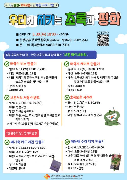 [½Åµ¿¾Æ¹æ¼Û ÀÎõ= À±¹Î½Ä±âÀÚ]ÀÎõ±¤¿ª½Ã±³À°Ã»ºÎÆòµµ¼­°ü(°üÀå ±èÀ翵)Àº ÀÎõº¸ÈÆÁöûÀÌ ÁÖÃÖÇÏ´Â ¡®º¸ÈÆ ¶óÀ̺귯¸®¡¯ °ø¸ð»ç¾÷¿¡ ¼±Á¤µÇ¾î, 6¿ù ȯ°æÀÇ ³¯°ú È£±¹º¸ÈÆÀÇ ´ÞÀ» ¿¬°èÇÑ ¡¸¿ì¸®°¡ ÁöŰ´Â Ãʷϰú ÆòÈ­¡¹ ÇÁ·Î±×·¥À» ¿î¿µÇÑ´Ù°í 28ÀÏ ¹àÇû´Ù. ÇÁ·Î±×¡¦