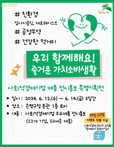 [½Åµ¿¾Æ¹æ¼Û ÀºÆò±¸=À̽ŵ¿±âÀÚ]ÀºÆò±¸´Â ¿À´Â 12ÀϺÎÅÍ 14ÀϱîÁö ÀºÆò±¸Ã» º»°ü 1Ãþ ·Îºñ¿¡¼­ ¡®»çȸÀû°æÁ¦±â¾÷ Á¦Ç° Àü½Ã‧È«º¸ Ưº°±âȹÀü¡¯À» °³ÃÖÇÑ´Ù°í ¹àÇû´Ù. À̹ø Çà»ç´Â ¼­¿ï½Ã¿Í Çù¾÷À¸·Î ÁøÇàµÈ´Ù. ±¸¹Î°ú Á÷¿øµé¿¡°Ô »çȸÀû°¡Ä¡¸¦ ½ÇÇöÇÏ´Â »çȸÀû¡¦