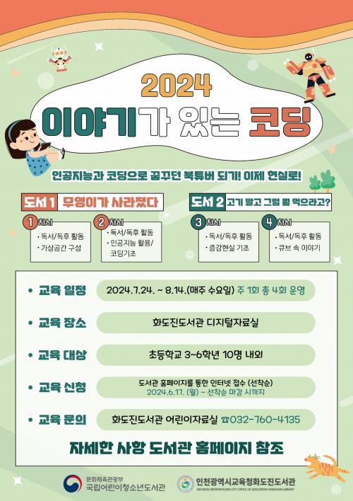 [½Åµ¿¾Æ¹æ¼Û ÀÎõ= À±¹Î½Ä±âÀÚ]ÀÎõ±¤¿ª½Ã±³À°Ã»È­µµÁøµµ¼­°ü(°üÀå À̼ҿí)Àº ÀÎõ Áö¿ª ÃʵîÇб³ 3~6Çгâ ÇлýÀ» ´ë»óÀ¸·Î 2024³â ¡®À̾߱Ⱑ ÀÖ´Â ÄÚµù¡¯ ÇÁ·Î±×·¥À» 7¿ù 24ÀϺÎÅÍ 8¿ù 14ÀϱîÁö ¸ÅÁÖ ¼ö¿äÀϸ¶´Ù ¿î¿µÇÑ´Ù. ¡®À̾߱Ⱑ ÀÖ´Â ÄÚµù¡¯Àº ±¹¸³¾î¸°ÀÌû¡¦