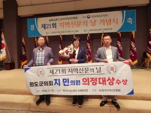 [½Åµ¿¾Æ¹æ¼Û=¿Ïµµ À̼±Á¾ ±âÀÚ] ¿Ïµµ±ºÀÇȸ Áö¹Î ÀÇ¿øÀÌ Áö³­ 26ÀÏ Çѱ¹ÇÁ·¹½º¼¾ÅÍ ±¹Á¦È¸ÀÇÀå¿¡¼­ ¿­¸° ¡®Á¦21ȸ Áö¿ª½Å¹®ÀÇ ³¯¡¯ ±â³ä½Ä¿¡¼­ ±âÃÊÀÇȸ ÀÇÁ¤´ë»óÀ» ¼ö»óÇß´Ù. »ç´Ü¹ýÀÎ Àü±¹Áö¿ª½Å¹®Çùȸ°¡ °³ÃÖÇÑ À̳¯ ±â³ä½Ä¿¡¼­´Â Áö¿ª½Å¹®´ë»ó°ú ÀÇÁ¤´ë»ó¡¦
