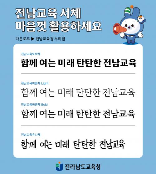 [½Åµ¿¾Æ¹æ¼Û=À̽ŵ¿±âÀÚ] Àü¶ó³²µµ±³À°Ã»(±³À°°¨ ±è´ëÁß)ÀÌ Àü³²±³À° Àü¿ë¼­Ã¼¸¦ °³¹ßÇØ ¹«·á·Î ¹èÆ÷ÇÑ´Ù. À̹ø¿¡ °³¹ßµÈ Àü³²±³À° Àü¿ë¼­Ã¼´Â °íµñ °è¿­(¶Ç¹Úü), ¸íÁ¶ °è¿­(¹Ù¸¥Ã¼), ¼Õ±Û¾¾ °è¿­(À¯³ªÃ¼) µî 3°¡Áö ŸÀÔÀÇ ±Û¾¾Ã¼ 4Á¾À̸ç ÇÑ±Û 2780ÀÚ, ¿µ¹® 94ÀÚ,¡¦