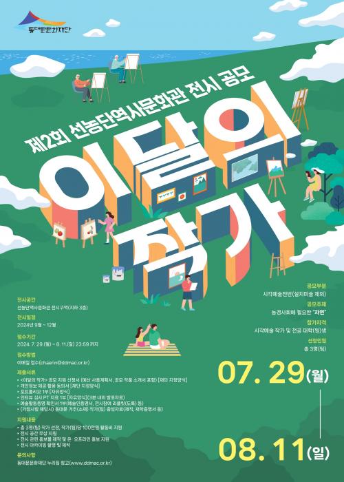 [½Åµ¿¾Æ¹æ¼Û=À̽ŵ¿±âÀÚ] µ¿´ë¹®¹®È­Àç´Ü(´ëÇ¥ÀÌ»ç ±è°æ¿í)ÀÌ 8. 11.(ÀÏ)±îÁö Á¦2ȸ ¼±³ó´Ü¿ª»ç¹®È­°ü ¡®ÀÌ´ÞÀÇ ÀÛ°¡¡¯ Àü½Ã¿¡ Âü¿©ÇÒ ÀÛ°¡¸¦ °ø°³ ¸ðÁýÇÑ´Ù. Àü½Ã ÁÖÁ¦´Â ¡®³ó°æ»çȸ¿¡ ÇÊ¿äÇÑ ÀÚ¿¬¡¯À̸ç, ¸ðÁý ºÐ¾ß´Â ¼³Ä¡¹Ì¼úÀ» Á¦¿ÜÇÑ ½Ã°¢¿¹¼ú(Æò¸é ÀÛǰ) ÀÛǰÀÌ¡¦