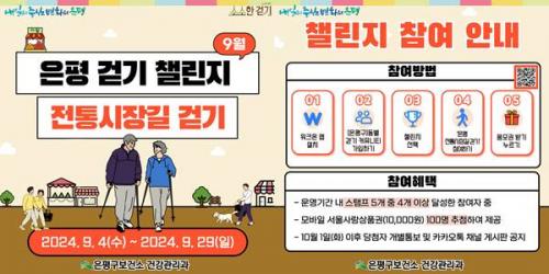 [½Åµ¿¾Æ¹æ¼Û=À̽ŵ¿±âÀÚ]ÀºÆò±¸(±¸Ã»Àå ±è¹Ì°æ)´Â ¿À´Â 4ÀϺÎÅÍ ¿À´Â 29ÀϱîÁö ¡®ÀºÆò ÀüÅë½ÃÀ屿 °È±â¡¯Ã§¸°Áö¸¦ ¿î¿µÇÑ´Ù°í ¹àÇû´Ù. ¡®ÀºÆò ÀüÅë½ÃÀ屿 °È±â¡¯ 縰Áö´Â °ü³» ÀüÅë½ÃÀå 5°÷À» ¹æ¹®ÇØ °È±â¿¡ Âü¿©ÇÑ ÈÄ ¿Â¶óÀÎÀ¸·Î ½ºÅÆÇÁ¸¦ ¹Þ´Â ÇÁ·Î±×·¥ÀÌ´Ù. Âü¡¦