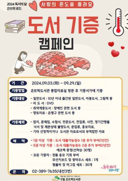 [½Åµ¿¾Æ¹æ¼Û=À̽ŵ¿±âÀÚ] ÀºÆò±¸(±¸Ã»Àå ±è¹Ì°æ)´Â ±¸¸³ Àº¶ß¶ôµµ¼­°ü¿¡¼­ 9¿ù µ¶¼­ÀÇ ´Þ Çà»ç¸¦ ¸ÂÀÌÇØ µµ¼­ ±âÁõ Ä·ÆäÀÎ ¡®»ç¶ûÀÇ ¿Âµµ¸¦ ¿Ã·Á¿ä¡¯¸¦ ¿À´Â 29ÀϱîÁö ¿î¿µÇÑ´Ù°í ¹àÇû´Ù. ¡®»ç¶ûÀÇ ¿Âµµ¸¦ ¿Ã·Á¿ä¡¯ µµ¼­ ±âÁõ Ä·ÆäÀÎÀº ±¸¹ÎÀÌ º¸À¯Çϰí ÀÖ´Â µµ¼­¸¦ ¡¦