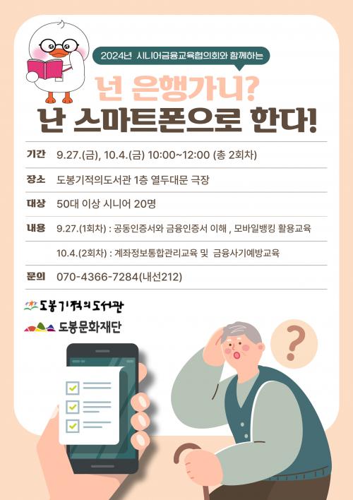 [½Åµ¿¾Æ¹æ¼Û=À̽ŵ¿±âÀÚ] µµºÀ±¸(±¸Ã»Àå ¿À¾ð¼®) µµºÀ±âÀûÀǵµ¼­°üÀÌ ¡®½Ã´Ï¾î±ÝÀ¶±³À°ÇùÀÇȸ¡¯¿Í Çù·ÂÇØ 50´ë ÀÌ»ó ¾î¸£½ÅÀ» À§ÇÑ µðÁöÅбÝÀ¶±³À° °úÁ¤ ¡¸³Í ÀºÇà°¡´Ï? ³­ ½º¸¶Æ®ÆùÀ¸·Î ÇÑ´Ù!¡¹¸¦ ¿î¿µÇÑ´Ù. ±³À°Àº 9¿ù 27ÀÏ, 10¿ù 4ÀÏ ÃÑ 2ȸ·Î ³ª´² ÁøÇàµÈ´Ù. µðÁö¡¦