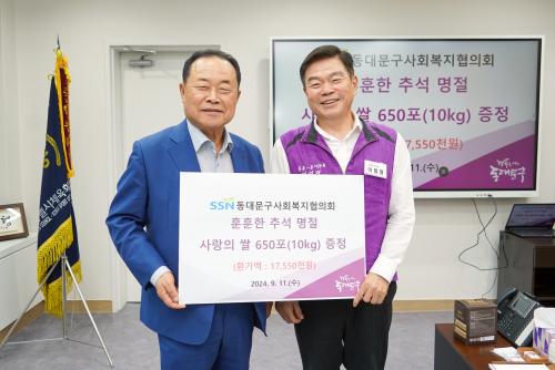 [½Åµ¿¾Æ¹æ¼Û=À̽ŵ¿±âÀÚ] µ¿´ë¹®±¸(±¸Ã»Àå ÀÌÇÊÇü)´Â 11ÀÏ µ¿´ë¹®±¸»çȸº¹ÁöÇùÀÇȸ(ȸÀå ¹Ú»óÁ¾)¿¡¼­ Ãß¼®À» ¸Â¾Æ 10kg »óÁÖ »ï¹é½Ò 650Æ÷(ȯ°¡¾× 1,755¸¸ ¿ø »ó´ç)¸¦ Àü´ÞÇß´Ù°í ¹àÇû´Ù. µ¿´ë¹®±¸»çȸº¹ÁöÇùÀÇȸ´Â 2005³âºÎÅÍ ¸Å³â ¼³°ú Ãß¼®¸¶´Ù Àú¼Òµæ °¡Á¤À» À§ÇÑ¡¦
