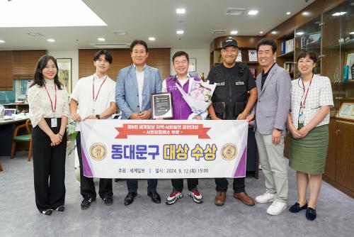 [½Åµ¿¾Æ¹æ¼Û=ÀÌ¿ø¼º±âÀÚ] ¼­¿ï µ¿´ë¹®±¸(±¸Ã»Àå ÀÌÇÊÇü)°¡ 12ÀÏ Çѱ¹ÇÁ·¹½º¼¾ÅÍ¿¡¼­ ¿­¸° ¡®Á¦9ȸ ¼¼°èÀϺ¸ Áö¿ª¡¤»çȸ¹ßÀü °øÇå´ë»ó ½Ã»ó½Ä¡¯¿¡¼­ »çȸ°¥µîÇØ¼Ò ºÎ¹® ´ë»óÀ» ¼ö»óÇß´Ù. Áö¿ª¡¤»çȸ¹ßÀü °øÇå´ë»óÀº Áö¿ª°¥µî ÇØ¼Ò·Î »çȸ¹ßÀü¿¡ ±â¿©ÇÏ°í ÆòÈ­ÅëÀÏÀÇ ÃÊ¡¦