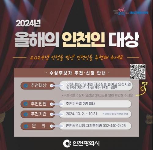 [½Åµ¿¾Æ¹æ¼Û ÀÎõ= À±¹Î½Ä±âÀÚ] ÀÎõ±¤¿ª½Ã´Â 2024³â ¡®¿ÃÇØÀÇ ÀÎõÀÎ ´ë»ó¡¯ Èĺ¸ÀÚ¸¦ 10¿ù 2ÀϺÎÅÍ 10¿ù 31ÀϱîÁö Ãßõ ¶Ç´Â ½ÅûÀ» ÅëÇØ Á¢¼öÇÑ´Ù°í ¹àÇû´Ù. ¡®¿ÃÇØÀÇ ÀÎõÀÎ ´ë»ó¡¯Àº ÀÎõ½Ã ÃÖ°í ±ÇÀ§ÀÇ ¸í¿¹·Î¿î »óÀ¸·Î, ÇÑ ÇØ µ¿¾È ÀÎõ½Ã¹ÎÀÇ ¸í¿¹¿Í ÀÚ±à½É¡¦