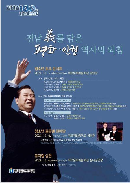 [½Åµ¿¾Æ¹æ¼Û ¸ñÆ÷½Ã=À̽ŵ¿±âÀÚ] Àü¶ó³²µµ±³À°Ã»Àº 11¿ù 5~6ÀÏ ¸ñÆ÷¹®È­¿¹¼úȸ°ü µî¿¡¼­ ±è´ëÁß Àü ´ëÅë·É ź»ý 100ÁÖ³âÀ» ±â³äÇÑ ¡®±è´ëÁß 100³â ÆòÈ­ Æä½ºÆ¼¹ú:û¼Ò³â ÆòÈ­¡¤À뱂 ¹®È­ÃàÁ¦¡¯¸¦ °³ÃÖÇÑ´Ù. Àü³² ÀÇ(ëù) ±³À° Ȱ¼ºÈ­ÀÇ Çϳª·Î ±âȹµÈ À̹ø ÃàÁ¦´Â û¼Ò¡¦
