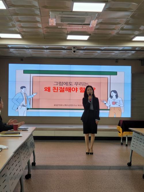 [½Åµ¿¾Æ¹æ¼Û ÇØ³²½Ã=À̽ŵ¿±âÀÚ] Àü¶ó³²µµÇس²±³À°Áö¿øÃ»Àº 11¿ù 4ÀÏ Á÷¿ø 90¿©¸íÀ» ´ë»óÀ¸·Î ¡®¿Ö Ä£ÀýÇØ¾ßÇÒ±î?¡¯¶ó´Â ÁÖÁ¦ÀÇ Á÷Àå±³À°À» ½Ç½ÃÇß´Ù. À̳¯ ±³À°Àº °ø°¨Ä¿¹Â´ÏÄÉÀÌ¼Ç ´ëÇ¥ ¹ÚÁø¿µ °­»çÀÇ °­ÀÇ·Î ÁøÇàµÇ¾ú´Ù. Á÷¿øµé¿¡°Ô ½Å·Ú¸¦ ÁÖ´Â ¾ð¾î »ç¿ë¹ý°ú Ä£Àý¡¦