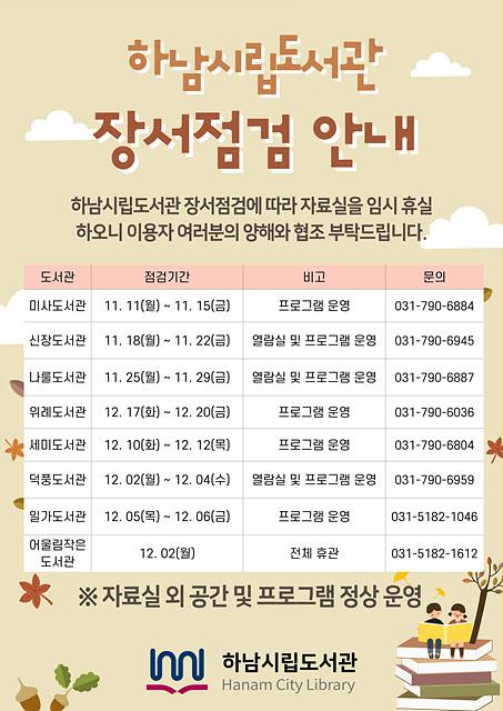 [½Åµ¿¾Æ¹æ¼Û Çϳ²½Ã=À̽ŵ¿±âÀÚ] Çϳ²½Ã´Â °ü³» °ø°øµµ¼­°ü 8°÷ÀÌ Àå¼­ Á¡°ËÀ» À§ÇØ 2024³â 11¿ù 11ÀϺÎÅÍ 12¿ù 20ÀϱîÁö µµ¼­°ü ÀÚ·á½ÇÀ» ¼øÂ÷ÀûÀ¸·Î ÈÞ½ÇÇÑ´Ù°í ¹àÇû´Ù. Àå¼­Á¡°ËÀº µµ¼­°ü¸®½Ã½ºÅÛÀÇ Àå¼­µ¥ÀÌÅÍ¿Í ½ÇÁ¦ Àå¼­ÀÇ ÀÏÄ¡¿©ºÎ¸¦ È®ÀÎÇϰí, ºÐ½Ç¡¤ÈѼյȡ¦