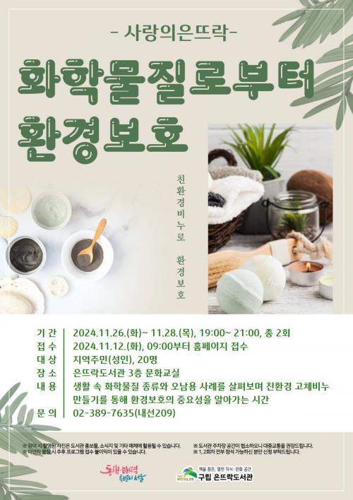 [½Åµ¿¾Æ¹æ¼Û ÀºÆò±¸=À̽ŵ¿±âÀÚ] ÀºÆò±¸´Â ¿À´Â 26ÀϺÎÅÍ 28ÀϱîÁö ±¸¸³ Àº¶ß¶ôµµ¼­°ü¿¡¼­ »ç¶ûÀÇ Àº¶ß¶ô ¡®È­Çй°Áú·ÎºÎÅÍ È¯°æº¸È£¡¯ ÇÁ·Î±×·¥À» ¿î¿µÇÑ´Ù°í ¹àÇû´Ù. µµ¼­°üÀº À̹ø ÇÁ·Î±×·¥À» ÅëÇØ ½Ç»ýȰ ¼Ó È­Çй°ÁúÀÇ ¿À³²¿ë »ç·Ê¿Í Á¾·ùµéÀ» »ìÆìº¸¸é¼­ ȯ°æ¿¡¡¦
