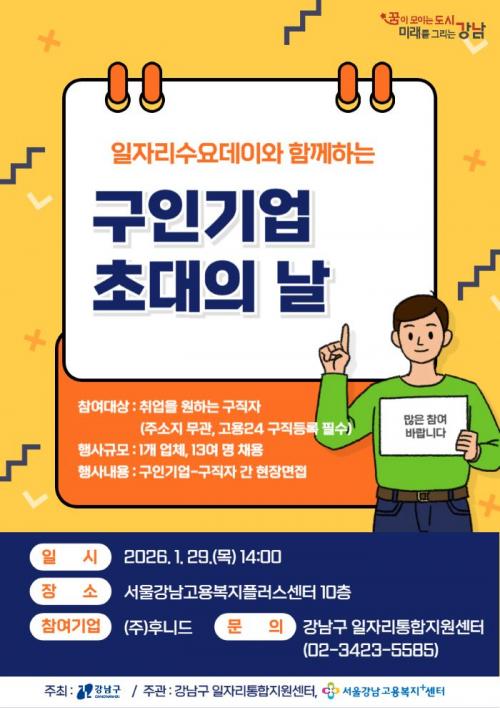 [½Åµ¿¾Æ¹æ¼Û °­³²±¸=À̽ŵ¿±âÀÚ] ²ÞÀÌ ¸ðÀÌ´Â µµ½Ã, ¹Ì·¡¸¦ ±×¸®´Â °­³²±¸°¡ ±¸Àαâ¾÷°ú ±¸Á÷ÀÚ¸¦ ÇöÀå¿¡¼­ ¿¬°áÇÏ´Â ¼Ò±Ô¸ð ä¿ë Çà»ç ¡®±¸Àαâ¾÷ ÃÊ´ëÀÇ ³¯¡¯À» ±â¾÷ ¼ö¿ä¿¡ ¸ÂÃá ¼ö½Ã ¿î¿µ ¹æ½ÄÀ¸·Î °³ÆíÇϰí, ¿À´Â 1¿ù 29ÀÏ ¿ÀÈÄ 2½Ã ¼­¿ï°­³²°í¿ëº¹ÁöÇ÷¯½º¼¾ÅÍ¿¡¼­¡¦